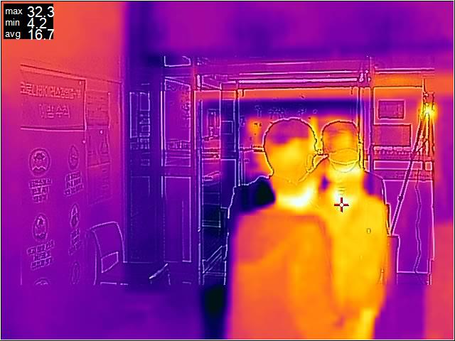 마지막으로는 저성능 열화상 카메라로 촬영한 이미지(위)와 고성능 데이터 기준으로 온도 보정이 이루어진 이미지(아래)입니다. 위 이미지를 살펴보면 저성능 카메라의 해상도가 많이 낮아 옷과 사람의 피부를 구별하기 쉽지 않음을 알 수 있습니다.