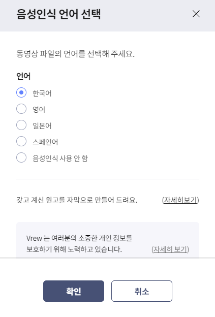 영상 속 자막으로 만들 음성인식 언어를 선택해줍니다.