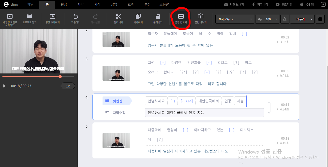 부자연스럽게 나누어져 있는 자막 클립을 합칠 수도 있는데요.