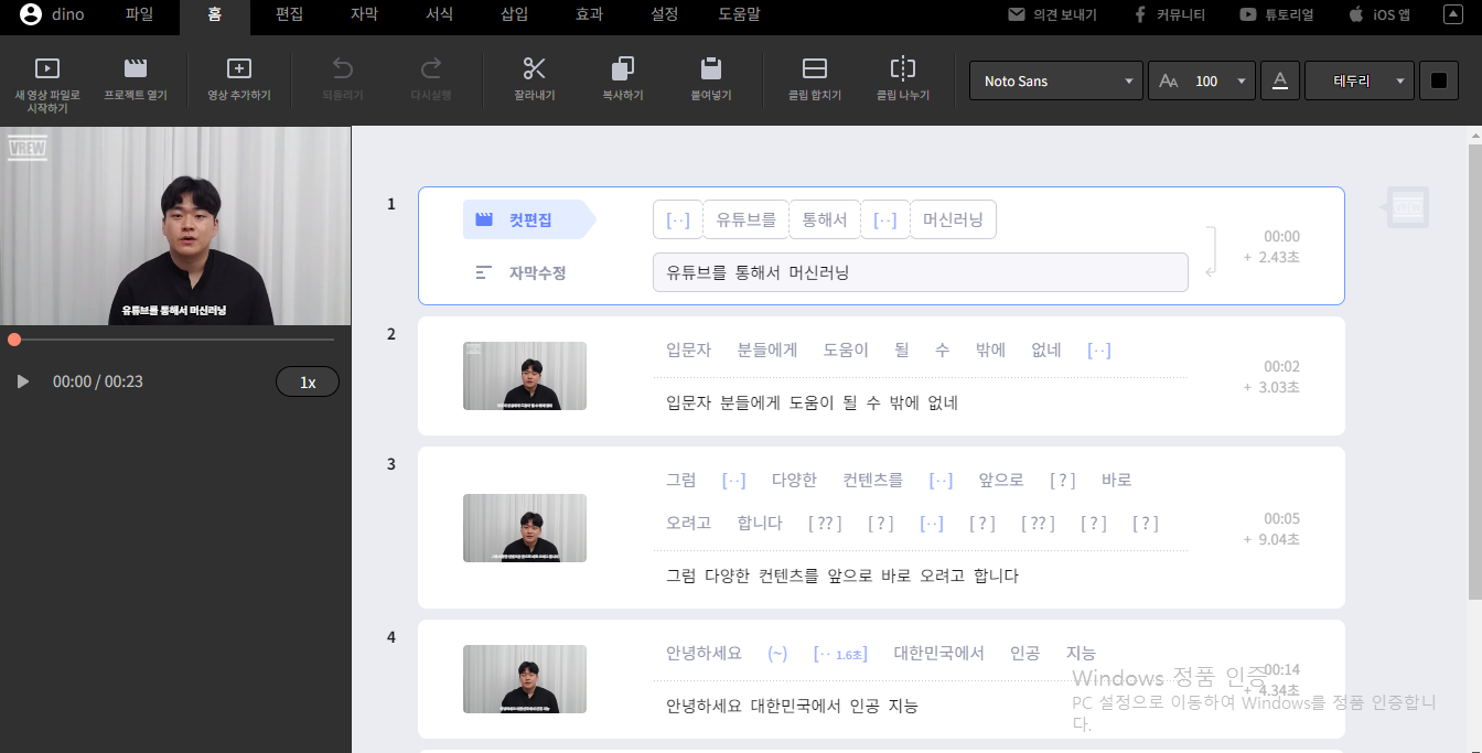 음성 분석이 끝나면 이렇게 컷 별로 자막이 자동으로 만들어집니다.