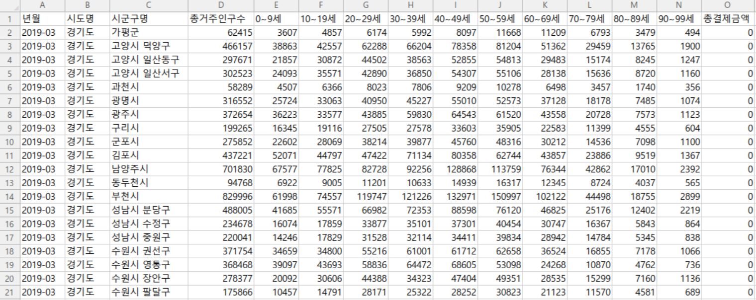 - 데이터 칼럼 : 년월, 시도명, 시군구명, 총거주인구수, 연령대별 지역화폐 사용 빈도수