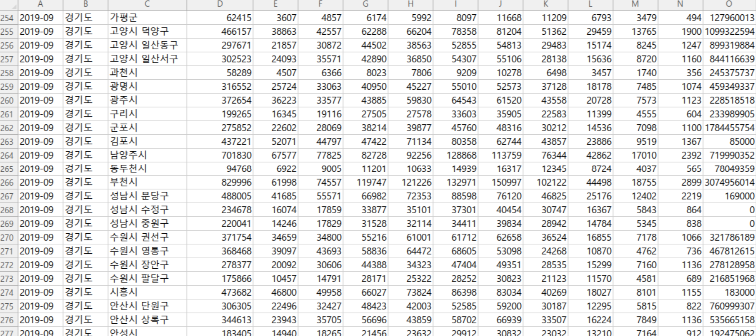 위 데이터를 보면 년월, 시도명, 시군구명, 총 거주 인구수 칼럼이 있고, 연령별 사용빈도수, 총 결제금액 칼럼이 있는 것을 확인할 수 있습니다. 여기서 총 결제금액은 시군구 행정동 별 결제금액인데요, 위 이미지 상에 나와 있는 데이터는 3월에 취득된 데이터로 총 결제금액이 0으로 되어있는 것으로 보아 3월에는 데이터가 구축되지 못한 것 같네요~ 그럼 9월에 총 결제금액이 나와있는 데이터를 살펴볼까요~?