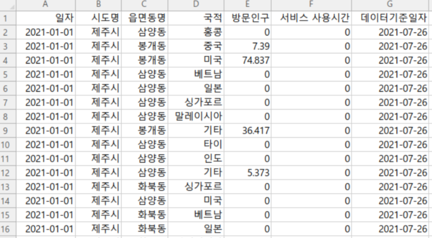 • 데이터 칼럼 : 일자, 시도명, 읍면동명, 국적, 방문인구, 서비스 이용시간, 데이터기준일자