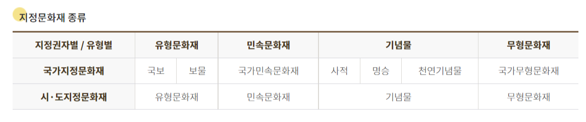 한편, 문화재의 종별을 보면 보물, 명승, 문화재, 천연 기념물, 유형 문화재 등 다양한 종별로 이루어져 있는데요, 각 문화재에 대한 분류는 아래와 같답니다.