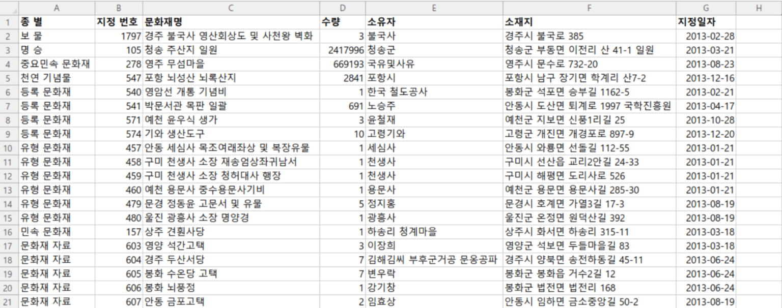 - 데이터 칼럼 : 종별, 지정 번호, 문화재명, 수량, 소유자, 소재지, 지정/승격일자
