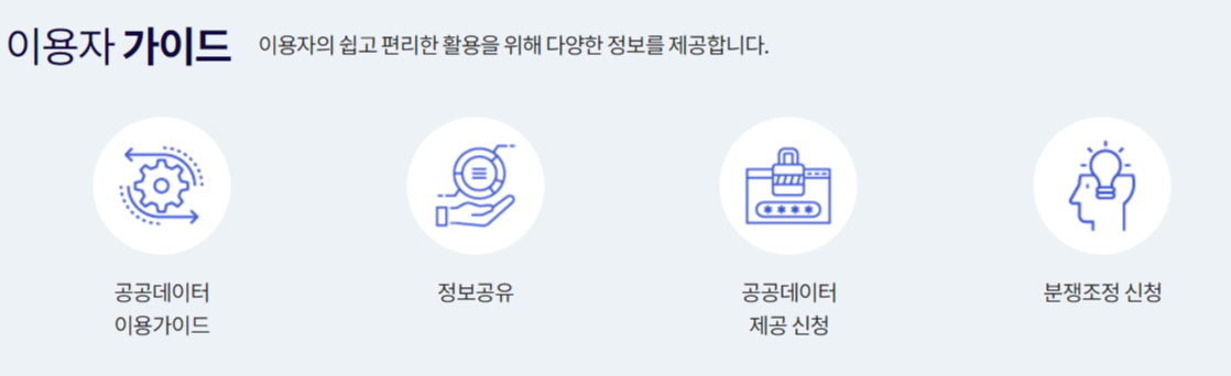 또한 공공데이터를 쉽고 편리하게 활용하기 위해 다양한 정보와 가이드를 제공하고 있답니다. 위 이미지처럼 경상북도 공공 데이터 플랫폼에서는 정보공유와 공공데이터 제공 신청이 가능하며, 분쟁조정 신청이 가능하답니다!