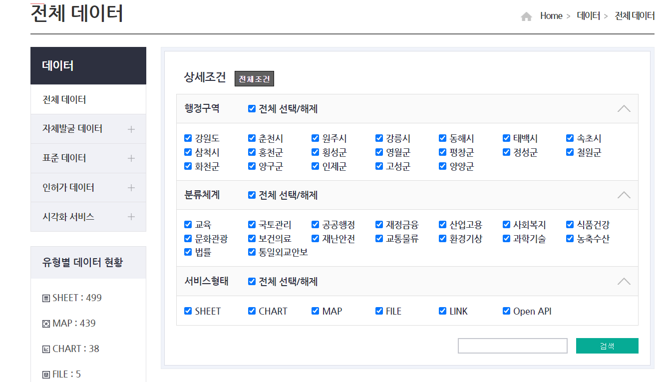 한편, 강원 공공데이터 포털에서는 '자체발굴 데이터', '표준 데이터', '인허가 데이터', '시각화 서비스'를 제공하고 있으며, 아래와 같이 행정구역, 분류체계, 서비스형태에 따른 데이터를 설정하여 원하는 데이터를 찾을 수 있답니다. 현재 제공되는 데이터는 약 500개로, 무료로 다운받으실 수 있습니다!