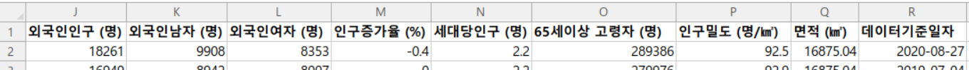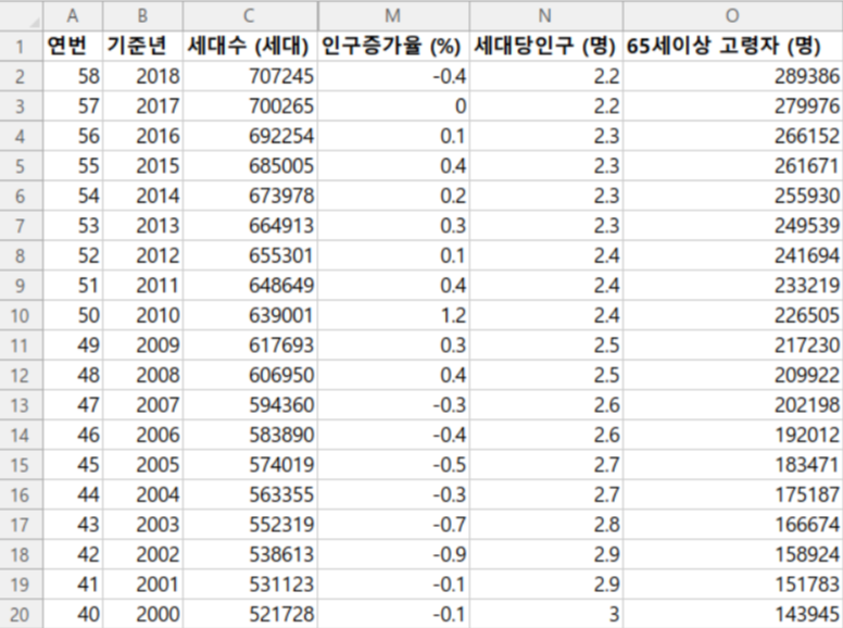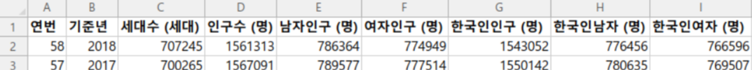 위 데이터는 전체 데이터의 일부를 캡쳐한 것인데요, 위 데이터를 살펴보면 첫 번째 행에는 칼럼 이름이 나와 있고 그 아래로는 데이터가 나열되어 있는 것을 살펴볼 수 있습니다. 한편, 칼럼은 보이는 칼럼 말고도 총 18개의 칼럼이 있는데요, 대표적으로 기준년, 세대수, 인구수, 한국인인구, 외국인인구, 인구증가율, 세대당인구, 인구밀도 칼럼이 있습니다.