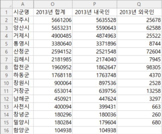한편, 위 데이터는 2013년도 관광객 합계 칼럼을 기준으로 정렬한 것으로, 당시 관광객 수가 많았던 곳은 진주시였는데요, 위에 2016년도 데이터와 비교해보면 진주시는 6위로 밀려나고, 5위에 있던 통영시가 관광도시 1위로 올라갔음을 살펴볼 수 있습니다. 이처럼 관광객의 수가 많아졌다는 것은 그만큼 그 도시가 관광도시로 발전했다고 볼 수 있고, 관광객의 수가 감소했다는 것은 그만큼 관광도시가 쇠퇴하고 있음을 나타내는 것이라 볼 수 있는데요, 관광 도시로 계속 이어나가기 위해선 이러한 수치 분석을 통해 다양한 대책이 마련될 필요가 있지 않을까 싶습니다~