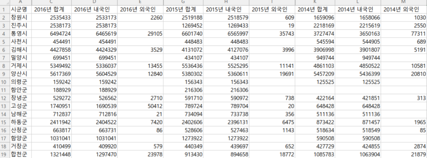 위 데이터는 전체 데이터의 일부를 캡쳐한 것인데요, 데이터를 살펴보면 맨 첫 번째 행에는 칼럼 이름이, 그 밑으로는 데이터가 나열되어 있는 것을 확인할 수 있습니다. 칼럼은 '시군명' 칼럼과 연도별(2013~2016) 관광객 합계, 내국인 관광객 수, 외국인 관광객수 칼럼으로 이루어져 있으며, 시군명 칼럼에는 총 19개의 시/군 지역에 대한 데이터가 있는 것을 확인할 수 있습니다.
