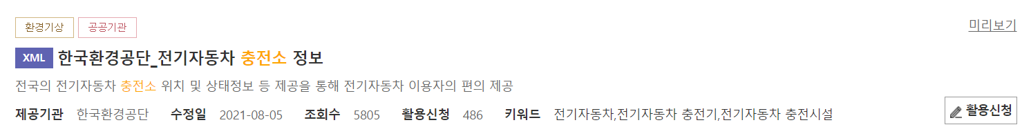 전기차충전소를 검색해 위와같이 환경공단에서 제공하는 API 서비스에 활용신청을 하고,