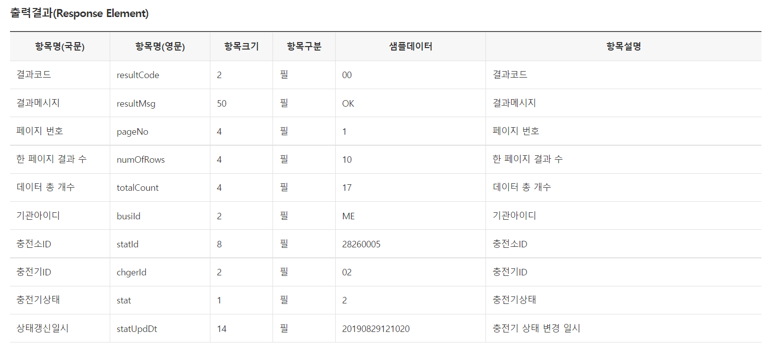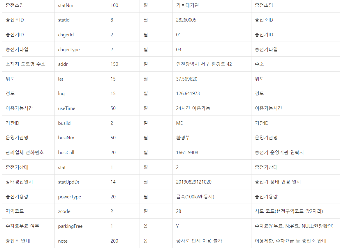 충전소 상태뿐만 아니라 운영기관, 충전소위치, 주차료무료 여부 등 충전소와 관련된 정보를 함께 수집하고자 하므로