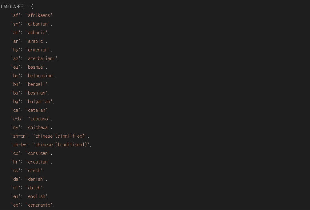 {'af': 'afrikaans', 'sq': 'albanian', 'am': 'amharic', 'ar': 'arabic', 'hy': 'armenian', 'az': 'azerbaijani', 'eu': 'basque', 'be': 'belarusian', 'bn': 'bengali', 'bs': 'bosnian', 'bg': 'bulgarian', 'ca': 'catalan', 'ceb': 'cebuano', 'ny': 'chichewa', 'zh-cn': 'chinese (simplified)', 'zh-tw': 'chinese (traditional)', 'co': 'corsican', 'hr': 'croatian', 'cs': 'czech', 'da': 'danish', 'nl': 'dutch', 'en': 'english', 'eo': 'esperanto', 'et': 'estonian', 'tl': 'filipino', 'fi': 'finnish', 'fr': 'french', 'fy': 'frisian', 'gl': 'galician', 'ka': 'georgian', 'de': 'german', 'el': 'greek', 'gu': 'gujarati', 'ht': 'haitian creole', 'ha': 'hausa', 'haw': 'hawaiian', 'iw': 'hebrew', 'he': 'hebrew', 'hi': 'hindi', 'hmn': 'hmong', 'hu': 'hungarian', 'is': 'icelandic', 'ig': 'igbo', 'id': 'indonesian', 'ga': 'irish', 'it': 'italian', 'ja': 'japanese', 'jw': 'javanese', 'kn': 'kannada', 'kk': 'kazakh', 'km': 'khmer', 'ko': 'korean', 'ku': 'kurdish (kurmanji)', 'ky': 'kyrgyz', 'lo': 'lao', 'la': 'latin', 'lv': 'latvian', 'lt': 'lithuanian', 'lb': 'luxembourgish', 'mk': 'macedonian', 'mg': 'malagasy', 'ms': 'malay', 'ml': 'malayalam', 'mt': 'maltese', 'mi': 'maori', 'mr': 'marathi', 'mn': 'mongolian', 'my': 'myanmar (burmese)', 'ne': 'nepali', 'no': 'norwegian', 'or': 'odia', 'ps': 'pashto', 'fa': 'persian', 'pl': 'polish', 'pt': 'portuguese', 'pa': 'punjabi', 'ro': 'romanian', 'ru': 'russian', 'sm': 'samoan', 'gd': 'scots gaelic', 'sr': 'serbian', 'st': 'sesotho', 'sn': 'shona', 'sd': 'sindhi', 'si': 'sinhala', 'sk': 'slovak', 'sl': 'slovenian', 'so': 'somali', 'es': 'spanish', 'su': 'sundanese', 'sw': 'swahili', 'sv': 'swedish', 'tg': 'tajik', 'ta': 'tamil', 'te': 'telugu', 'th': 'thai', 'tr': 'turkish', 'uk': 'ukrainian', 'ur': 'urdu', 'ug': 'uyghur', 'uz': 'uzbek', 'vi': 'vietnamese', 'cy': 'welsh', 'xh': 'xhosa', 'yi': 'yiddish', 'yo': 'yoruba', 'zu': 'zulu'}