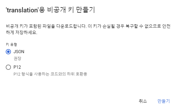 Google Cloud 에서 제공하는 번역 API의 경우 유료버전이므로 Cloud Translation API가 사용 설정된 프로젝트를 생성하여 API 활용 key를 발급받아야 합니다.