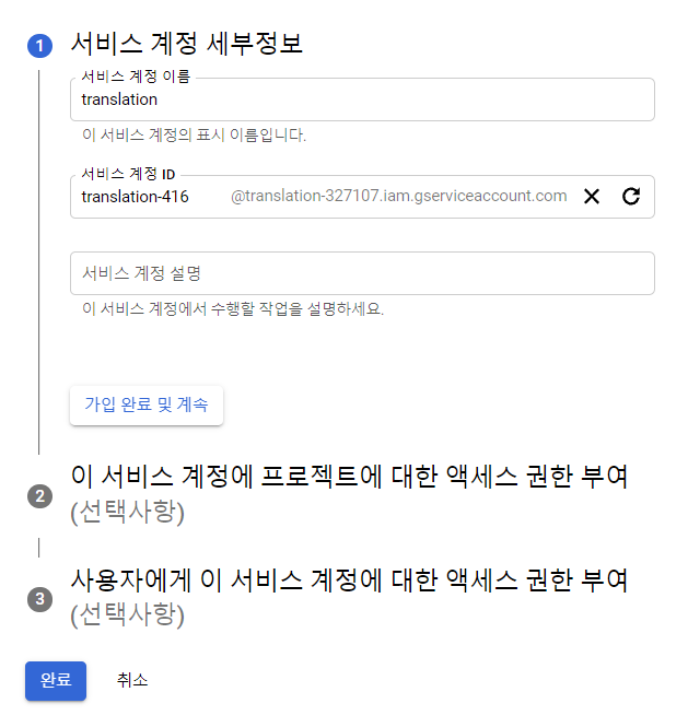 아래와 같이 서비스 계정 이름 필드에 이름을 입력한 뒤 가입 완료 및 계속, 완료 버튼을 클릭하여 서비스 계정가입을 완료합니다.