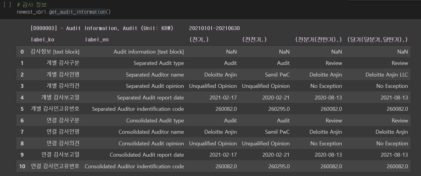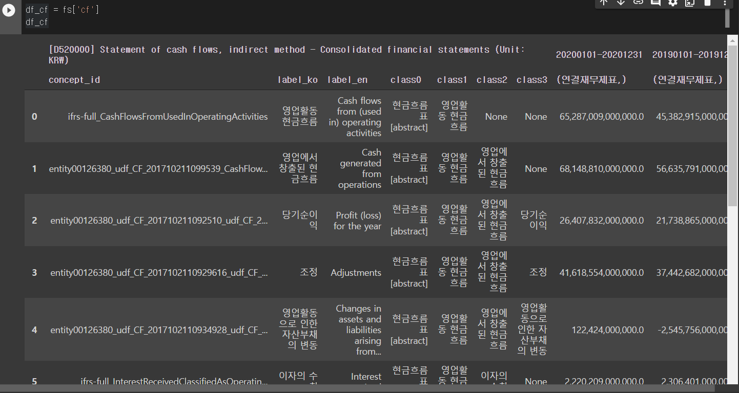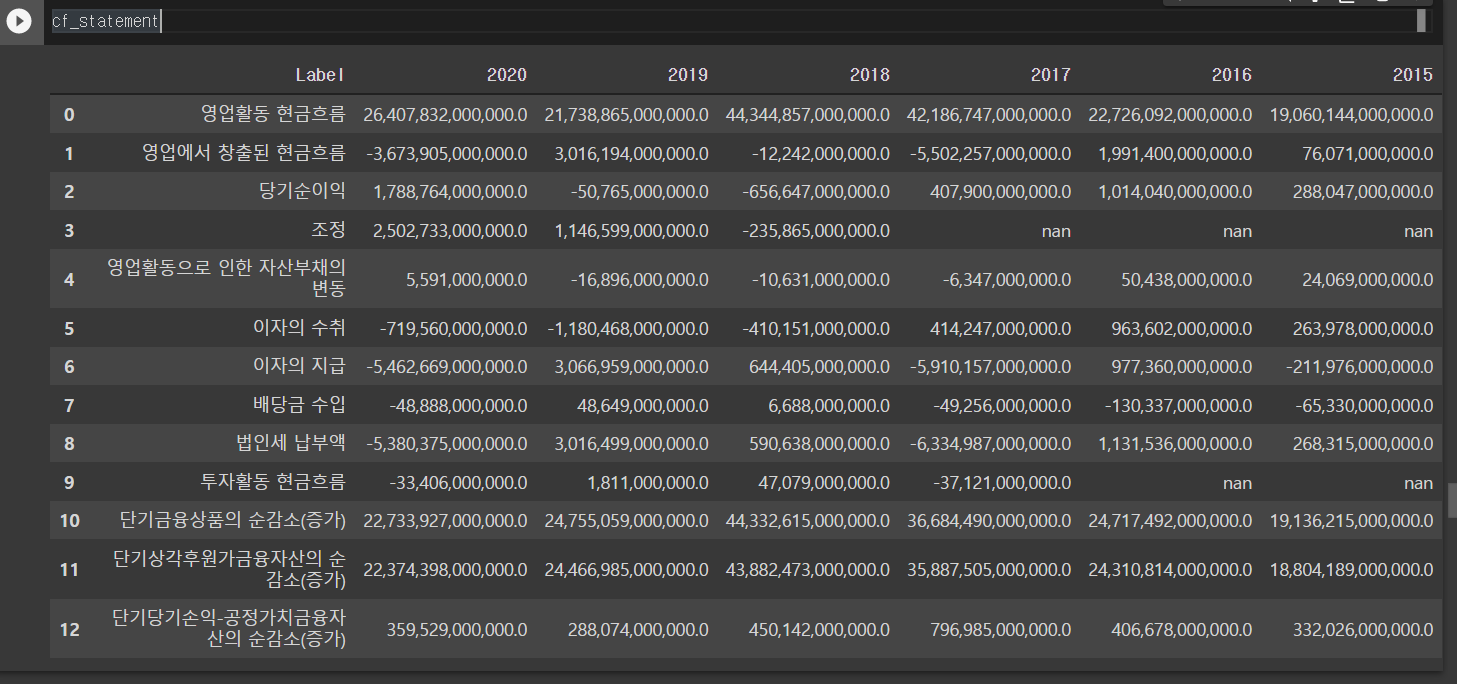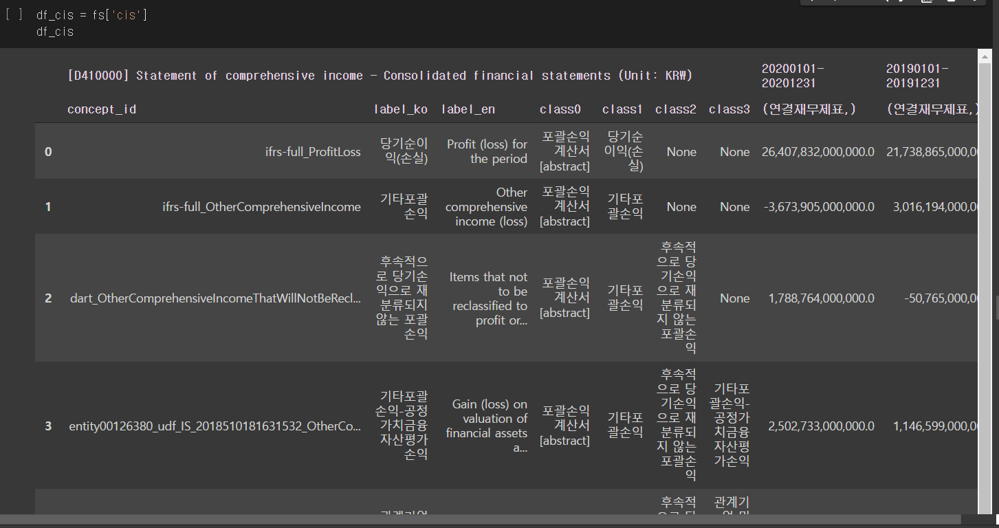 손익계산서, 재무상태표 이외에도 포괄손익계산서, 현금흐름표를 아래 코드를 활용하면 데이터프레임으로 나타낼 수 있습니다.