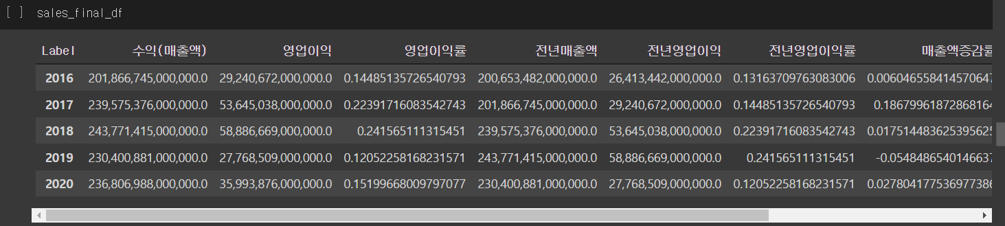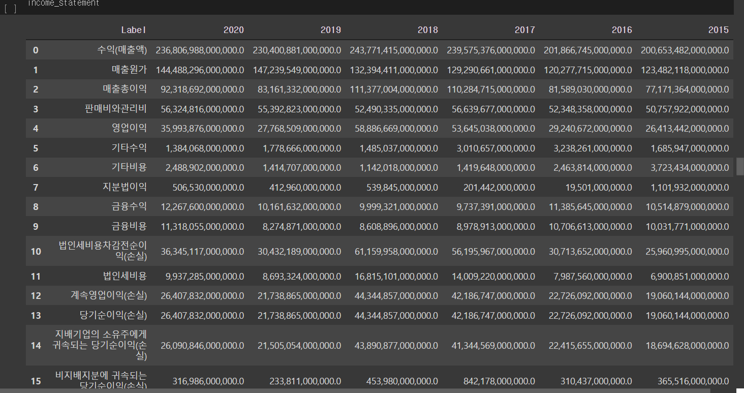 손익계산서 데이터프레임을 출력해보니 데이터가 보기 쉽게 정리되지 않았습니다.
