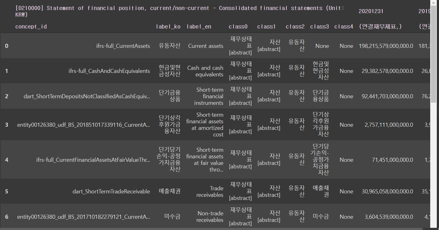이번에는 위에서 수집한 연간 연결재무제표 중에서 재무상태표(BS)만 데이터프레임으로 가져와보겠습니다.
