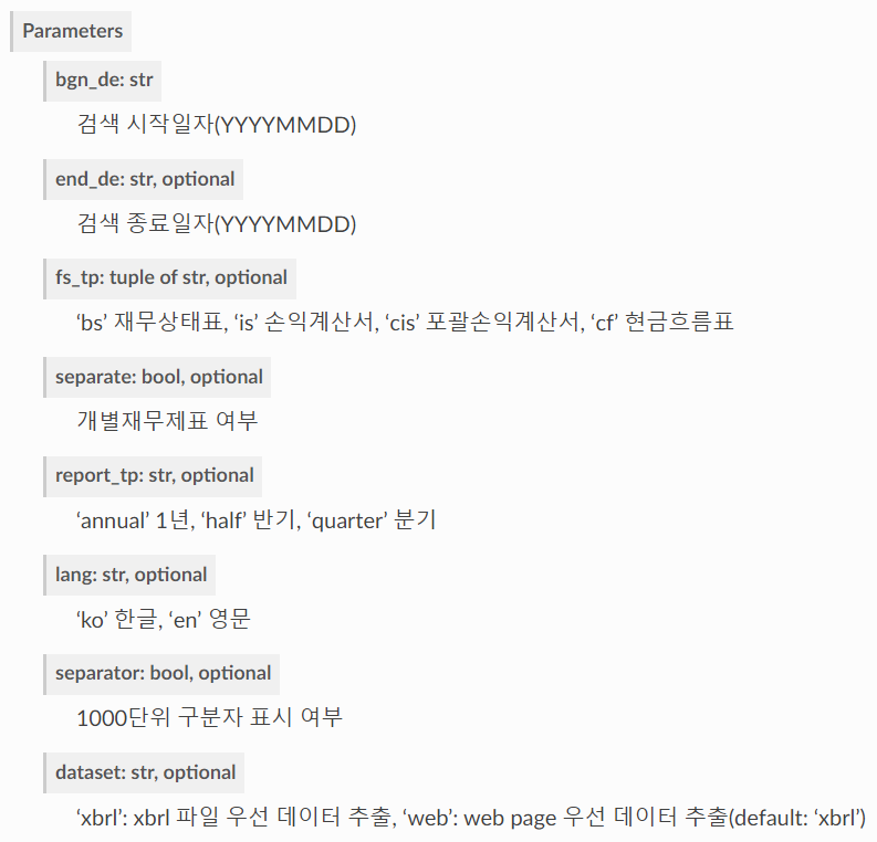 우선 재무제표를 정보를 가져오는 extract_fs( ) 메소드를 사용해 보겠습니다.