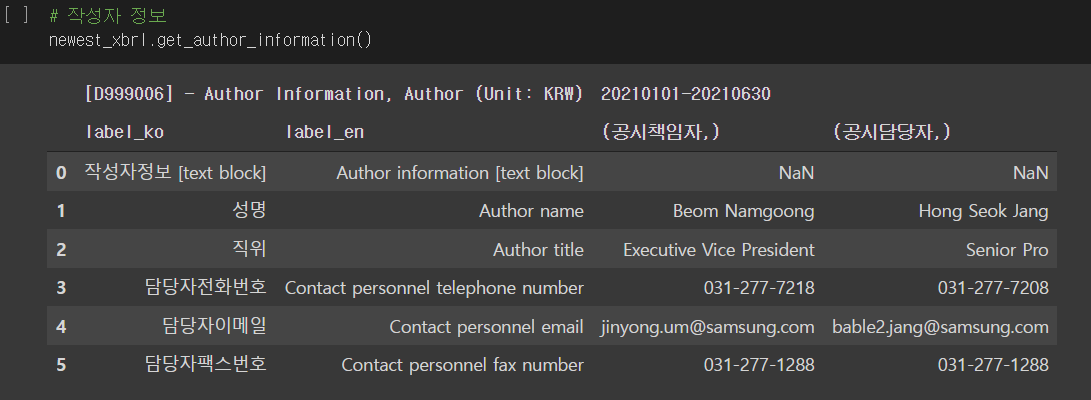 사실 samsung이란 변수도 dart_fss.corp.Corp 클래스의 인스턴스(객체)로서 메소드(기능)를 사용할 수 있습니다.