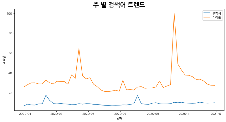시각화 결과 2020년 한 해동안은 "갤럭시"보다 "아이폰"을 검색한 사용자가 훨씬 많으며 아이폰12 발표 시기였던 2020년 10월에는 검색량이 크게 증가한 것을 확인할 수 있습니다.