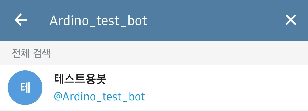 검색창에 이전에 입력한 username(Ardino_test_bot) 을 입력하여 시작버튼을 눌러준 뒤 첫번째 메세지를 보내보세요.