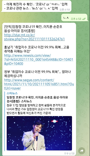 - 코로나 관련 뉴스 : '뉴스' or 'ㄴㅅ' 입력