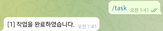 위 코드를 실행한 뒤 챗봇에게 /task라고 메세지를 보내게 되면 아래와 같이 cmd_task_buttons 에서 설정한대로 버튼이 생성되는 것을 확인할 수 있으며 이를 클릭할 경우 cb_button 에서 설정항대로 작업을 완료했다는 메세지를 보내는 것을 확인할 수 있습니다.