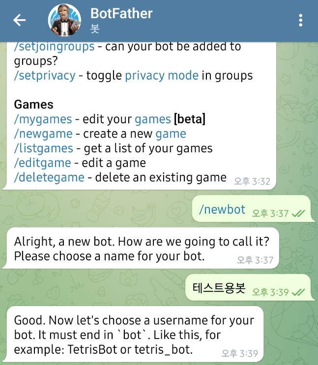 이전에 입력한 테스트용봇은 쉽게 말해 채팅방 이름이고, 지금 새로 생성할 username은 채팅방에서 사용되는 진짜 봇의 이름이니 구분하세요!!
