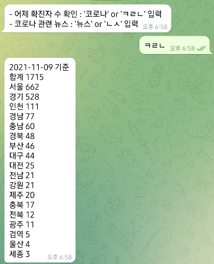 - 어제 확진자 수 확인 : '코로나' or 'ㅋㄹㄴ' 입력