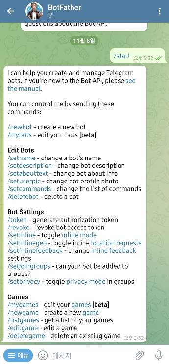 이후 시작 버튼을 클릭하면 아래와 같이 봇파더에게 말할 수 있는 여러가지 명령어들을 안내합니다.