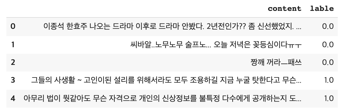 댓글과 레이블은 탭(\t)으로 구분되어 있으므로 sep 파라미터로 "\t" 를 사용해 데이터를 불러온다.
