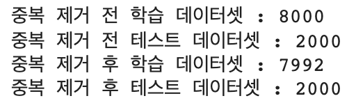 print('중복 제거 후 테스트 데이터셋 : {}'.format(len(test_data)))