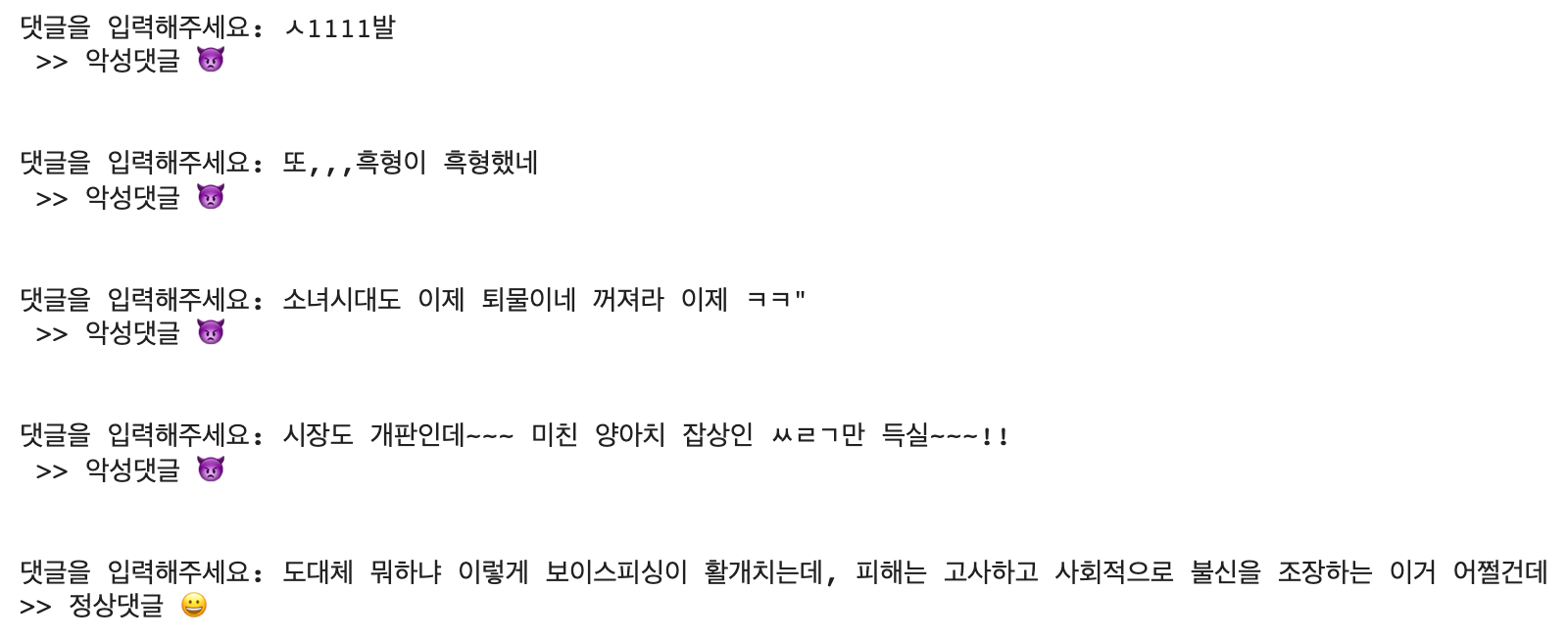 result = " >> 악성댓글 👿"