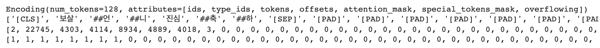 반환된 데이터를 보면 ids, type_ids, tokens, offsets, attention_mask, special_tokens_mask, overflowing 값들을 포함하고 있는 것을 확인할 수 있으며, tokens 값에는 [CLS], [SEP],[PAD] 과 같은 special_token을 포함하여 텍스트가 분리된 것을 확인할 수 있다. 또한 ids 값을 통해 각 token의 id를 확인할 수 있으며, attention_mask 값을 통해 패딩된 값을 구분할 수 있다.