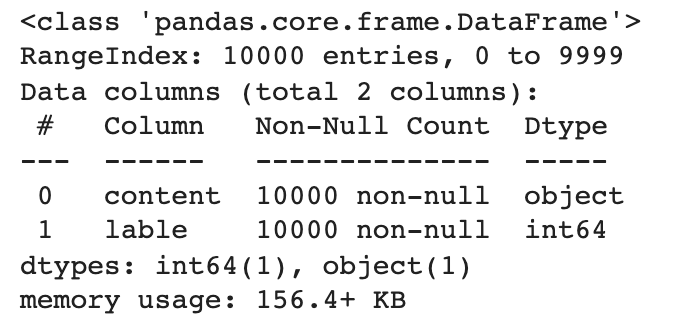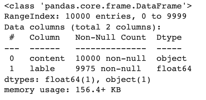 댓글 텍스트를 나타내는 content 는 10,000개의 데이터가 정확하게 로드되었지만, 악성댓글 여부를 나타내는 lable은 25개의 null 데이터가 존재하는 것을 확인할 수 있다.