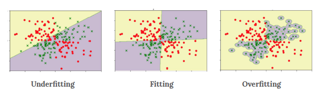 왼쪽부터 언더피팅 그림을 먼저 보자. 빨간색과 초록색 점의 구분이 제대로 되지 않는 즉, 학습이 덜 된 상태를 보여준다. 가운데 피팅은 두 점이 위치한 특징을 파악하여 영역을 색으로 잘 구분했으며 이를 통해 영역 안에서 빨간 점이 추가로 찍히더라도 잘 분류를 할 것이다. 마지막으로 세번째 오버피팅 그림을 보자. 정확히 학습에 사용된 데이터의 초록점만 보라색 영역으로 구분해 놓았다. 그야말로 완벽한 구분을 했지만 새로운 초록색 점이 찍힌다면 노란 영역의 빨간 점으로 잘못 분류할 것이다. 언더피팅은 학습을 충분히 시켜 줌으로써 해결이 가능하다. 우리가 주의해야할 것은 오버피팅이 되지 않게 하는 것이다. 그렇다면 오버피팅을 방지하기 위한 방법에는 무엇이 있을까? 다음 글에서 알아보도록 하자.
