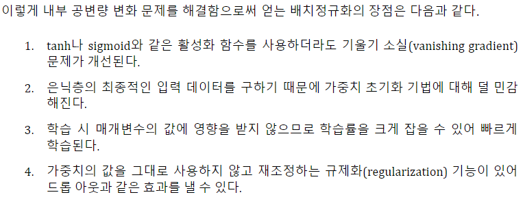 신경망의 학습 효율을 높이기 위해서 활성화 함수, 초기화, 학습률의 변화 등 다양한 방법들이 등장해왔다. 이러한 간접적인 방법들 뿐만 아니라 학습 과정 자체를 안정화 하기위한 근본적인 연구들 또한 진행이 되어왔다. 신경망의 불안정성에는 내부 공변량 변화(Internal Covariance Shift)의 문제가 있는데 이는 신경망의 각 층 별 활성화 함수로 들어가는 입력데이터의 분포가 다른 현상을 말한다. 내부 공변량 변화 문제를 해결함으로써 신경망 학습 자체의 안전성을 높이고자 등장한 기법이 바로 배치 정규화다.
