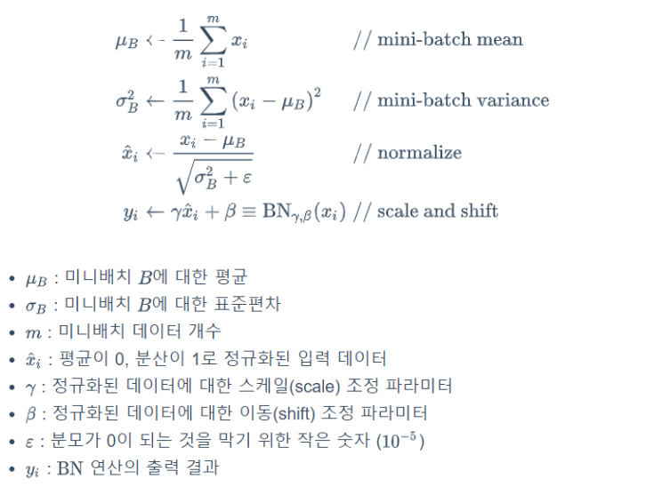 배치 정규화는 말 그대로 한 번에 들어오는 입력 단위인 배치 마다 정규화를 진행하는 기법이다. 이로써 활성화 함수의 입력 데이터를 정규분포로 맞추어 내부 공변량 변화를 해결한 것이다. 아래의 그림처럼 배치정규화는 활성화 함수를 통과하기 전에 배치 정규화 과정을 추가한다.