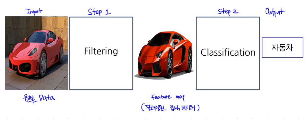 CNN은 입력으로 받은 자동차 사진을 ‘필터링’과 ‘분류’의 과정을 거쳐 자동차라고 출력하는데 이 과정을 멀리서 본다면 필터링 단계는 입력 받은 원본 데이터를 바로 분류하는 것보다 성능을 좋게 할 무언가를 만드는 단계라고 볼 수 있다. 이때 필터링을 거친 원본 데이터를 피처맵(feature map)이라고 하며 필터를 어떻게 설정할지에 따라 피처맵이 달라지므로 CNN에서 학습시켜야 할 대상은 바로 이 필터가 된다.
