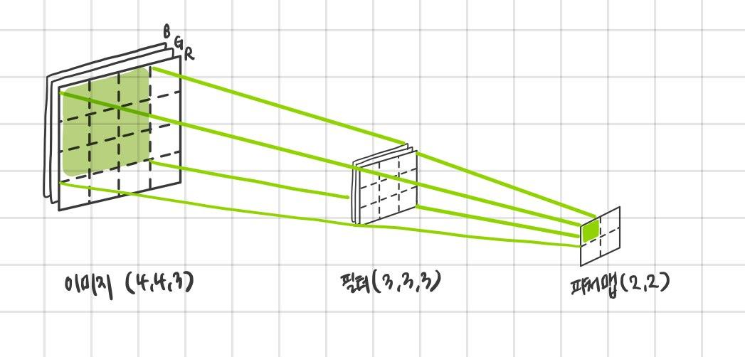 엄밀히 말하면 위 그림은 입력으로 채널이 하나인 흑백 사진의 피처맵 도출 과정이다. 이 과정을 세개의 채널(RGB)에 적용한 컬러 이미지의 경우 (높이, 너비, 채널)의 크기를 가지며 피처맵이 도출되는 과정은 아래의 그림과 같다.