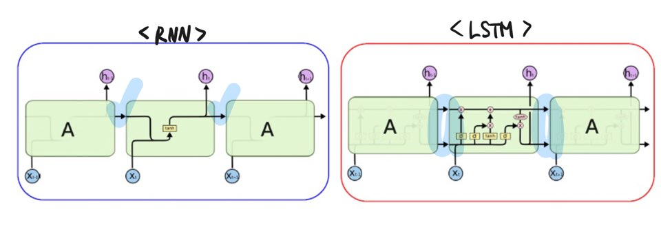 가장 간단하게 두 구조를 구별하는 방법은 타임스텝이 진행될때 한 셀에서 다음셀로 전달되는 정보의 개수를 확인하면 된다. 즉 위 그림에서는 셀과 셀 사이의 화살표 개수를 확인하면 되는것이다. 단기 기억 뿐인 RNN의 경우 다음 셀로 전달 되는 정보는 역시 바로 직전 타임스텝의 정보일 뿐이다. 그래서 그림에서 하나의 화살표만 볼 수 있다. 그러나 LSTM은 이름에서 보듯 Long-Short Term Momory 이므로 장기와 단기 기억이 모두 존재한다. 그러므로 구조 그림에서 두개의 화살표를 확인할 수 있다. 위 화살표는 장기 기억, 아래 화살표는 단기기억에 해당된다. 그림에서 보듯 단기 기억 뿐인 RNN을 보완하여 장기와 단기로 나누어서 정보를 전달하는 LSTM의 구조가 더욱 정교하다. 이로써 시계열, 텍스트 데이터 뿐만아니라 소리와 같은 오디오 데이터 등의 순차 데이터를 처리할 때 입력의 길이가 길어져도 이전 정보를 더 오래 기억하므로 RNN보다 더 성능이 좋다. 한마디로LSTM은 RNN보다 발전된 형태의 순환신경망인 것이다.