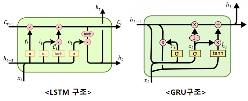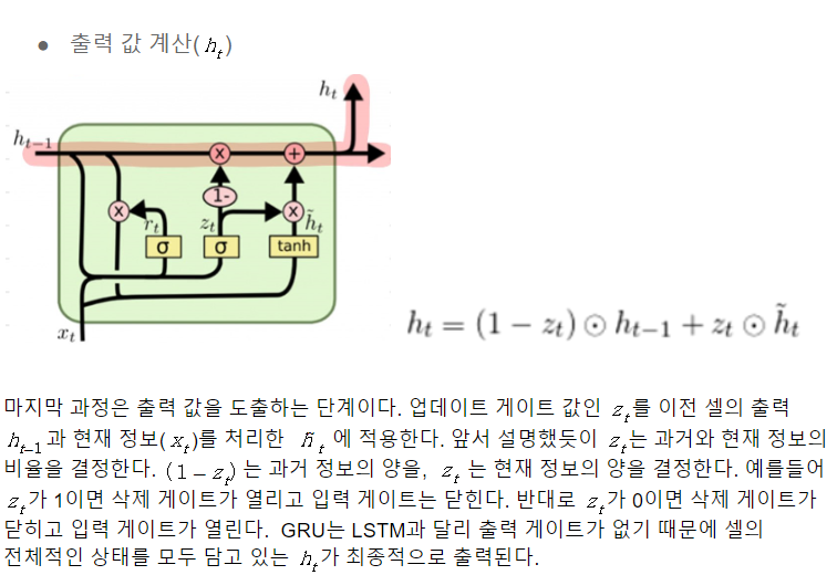 GRU - 리셋 게이트 /업데이트 게이트 / 입력정보 처리 / 출력 값 계산 출처