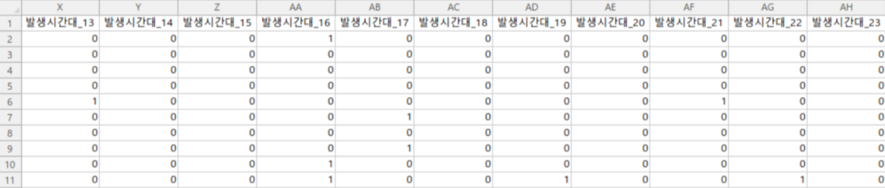 - 컬럼 : 발생년월, 발생경찰서명, 발생건수, 발생요일, 발생시간대, 월 평균 소득 금액, 총 상주인구 수