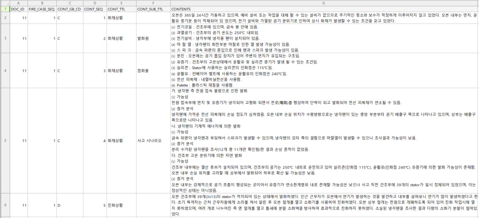 - 칼럼 : 화재사례 문서아이디, 화재사례 일련번호, 내용구분코드, 내용일련번호, 내용제목, 내용부제목, 내용