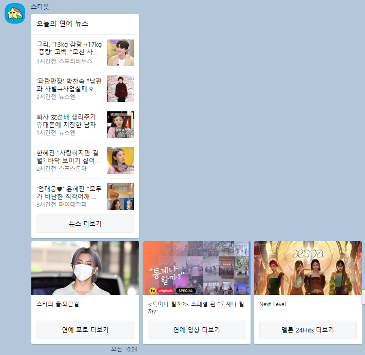 살짝 언급했다시피 최애 방송 스케줄, 출연 예정 프로그램 등은 스타봇으로 아직 확인하기 어려운데요. 앞으로 그런 다양한 정보들을 인공지능 서비스로 알 수 있다면 많은 팬들이 스타봇을 이용하기 쉽지 않을까요?