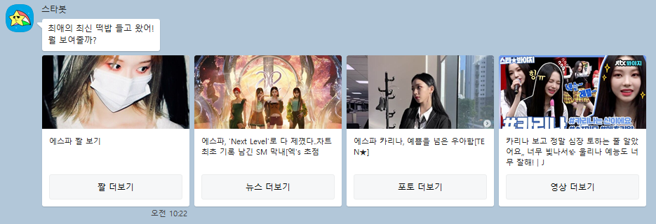 이렇게 방탄소년단을 채탕창에 직접 입력하거나, 채팅창 하단에 스타봇이 인공지능으로 추천해주는 검색어를 선택하면 원하는 정보를 바로 확인할 수 있다. '오마이걸 뉴스', '방탄 짤'을 입력하자 바로 결과가 짠!!(정말 똑똑합니다!+ㅡ+)