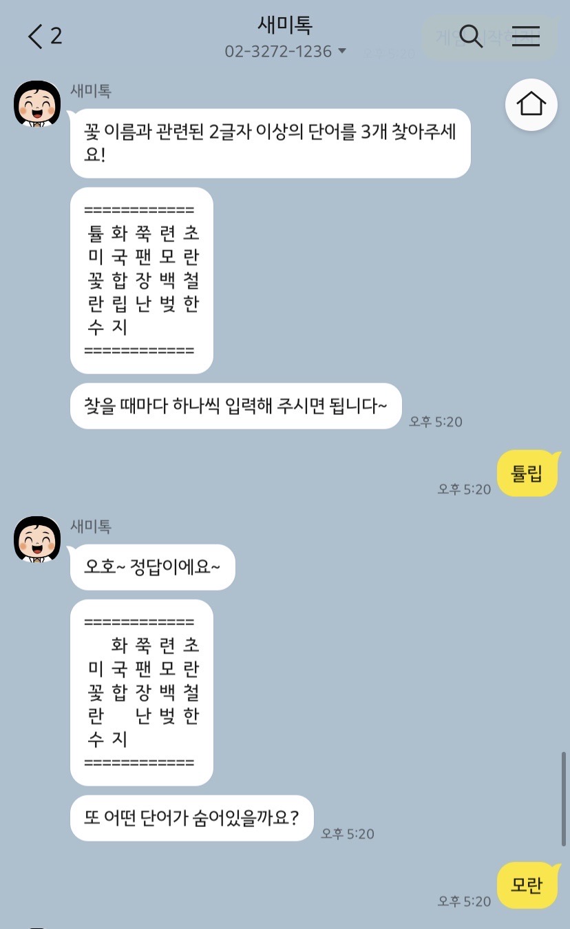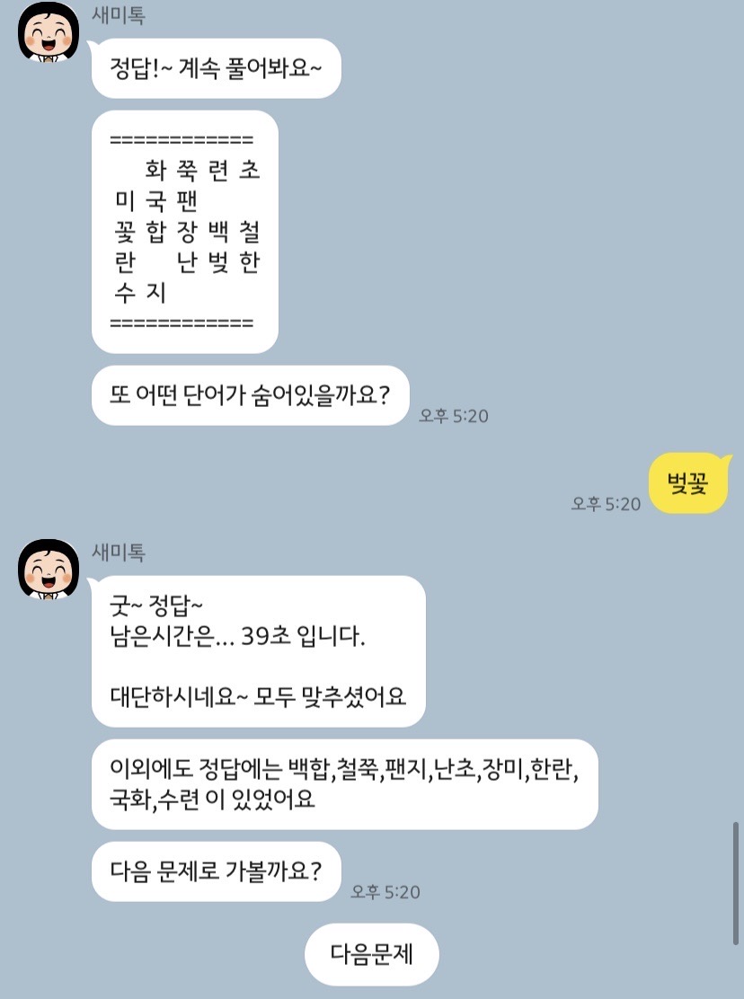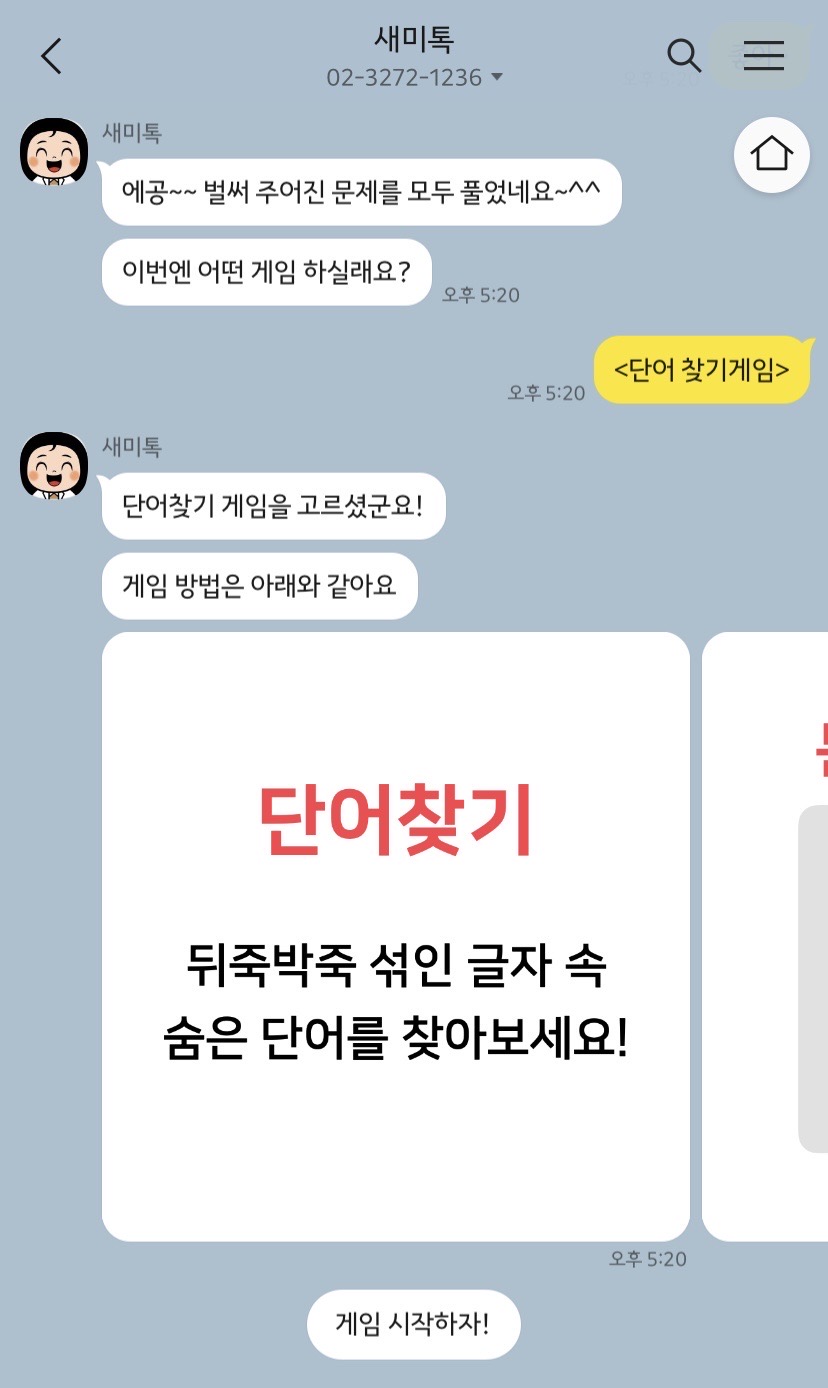 마찬가지로 새미가 게임 방법을 설명해줬어요. 주제어를 받으면, 눈에 보이는 단어를 직접 입력하는 게임입니다!