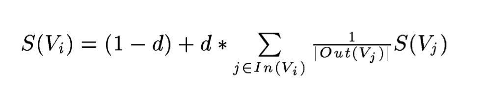 위 이미지는 상단에 주어진 글에 대해 텍스트 간 관계를 나타낸 그래프를 그린 샘플 이미지이다. 내용과 그래프를 비교해보면 각 문장에서 단어 간의 관계를 선으로 연결한 것을 살펴볼 수 있는데, 이때 순위는 다음과 같은 수식에 의해 매긴다고 한다.