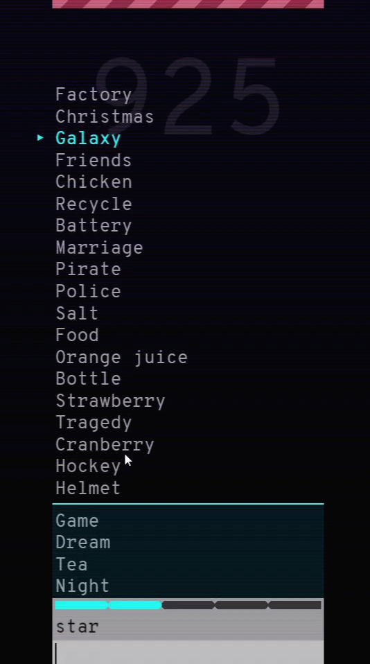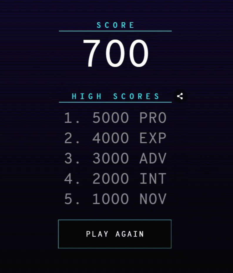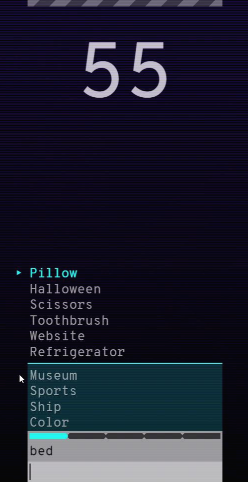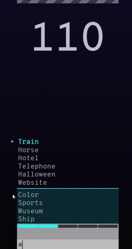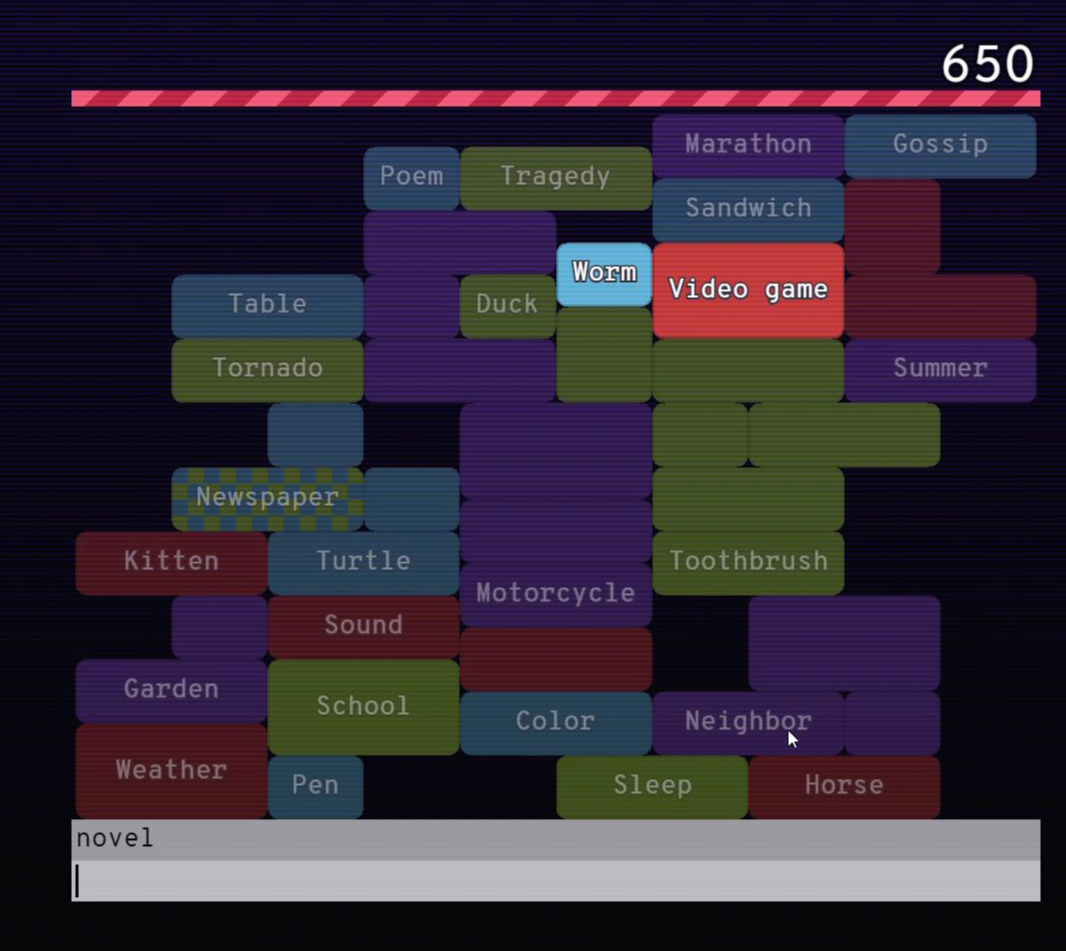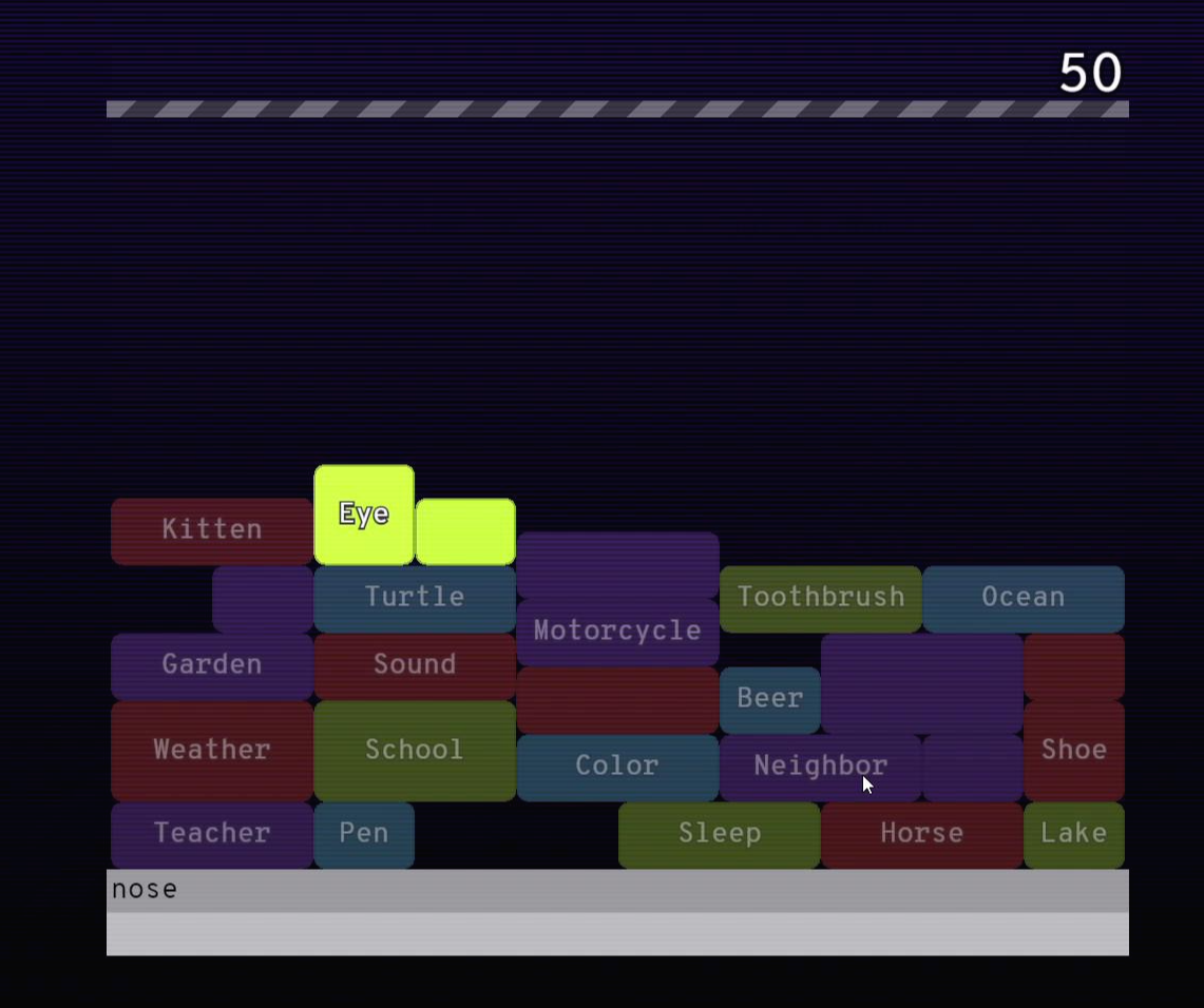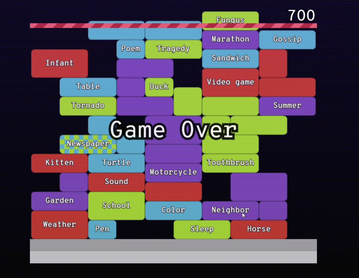쌓인 단어들이 위쪽 막대기에 닿으면 게임이 끝나는데, 후반부로 갈수록 단어들이 빨리 쌓이기 때문에, 더 빨리 게임을 진행하는 것이 중요한 것 같아요.